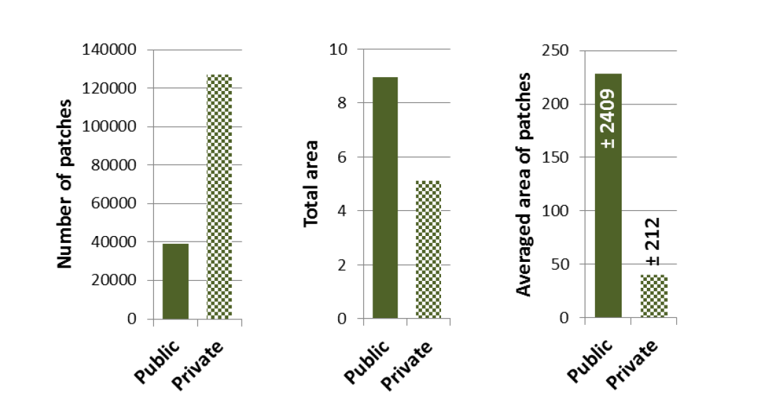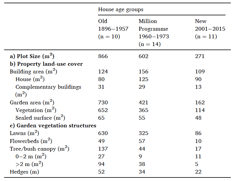 Parmi les récents travaux qui alimentent cette thèse, l’article d’Helena I. Hanson et al. (Hanson et al., 2021) et éclairant : à partir de l’étude de l’usage du sol dans un corpus de 35 jardins privés situés dans la région de Lund en Suède et de la conduite d’entretiens semi-directifs avec leurs propriétaires, les auteurs affirment que la densification urbaine, en réduisant la taille des jardins, réduit également leur biodiversité. Les données issues du travail d’inventaire sur le corpus de jardins fait pourtant ressortir (et les auteurs l’évoque succinctement dans leur conclusion) que plus les jardins sont grands, plus ils sont pauvres en biodiversité car largement occupés par des pelouses (86% de l’occupation du sol dans les parcelles d’une surface supérieure à 730m² contre 53% pour les parcelles de surface inférieure à 271m²). L’analyse de ces données permet pourtant de formuler deux affirmations :