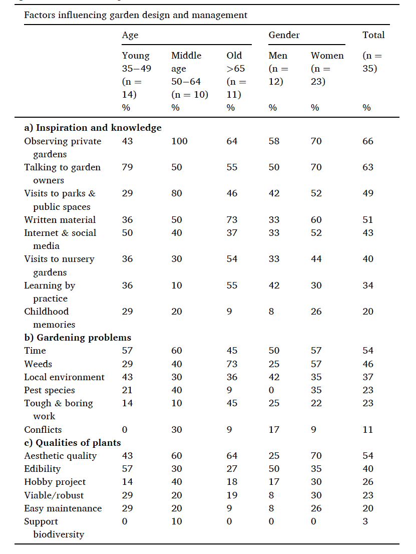 Le rapport entre a), b) et les caractéristiques des jardins est complexe. Il ne s’agit pas un simple rapport de “causes à effets” et le fondement qui guident les actions des jardiniers dépendent de nombreuses exigences individuelles. Si les caractéristiques physiques du jardin comptent, la question de l’âge du jardinier ou encore la durée de résidence sur le terrain comptent parmi les nombreux critères mis en avant dans différentes études (Loram et al., 2011), (Tresch et al., 2019), (Hanson et al., 2021), (Tassin de Montaigu & Goulson, 2024).