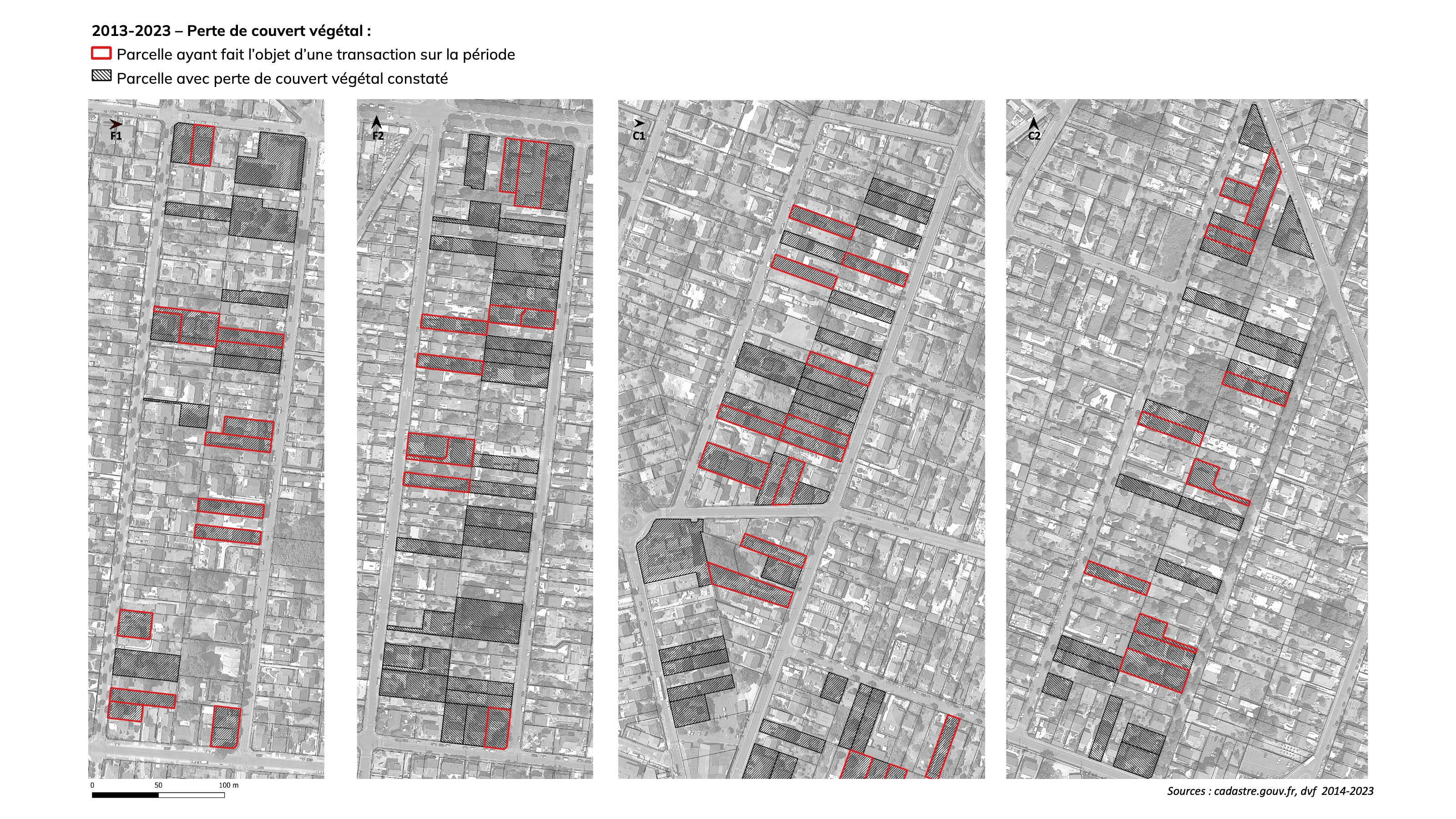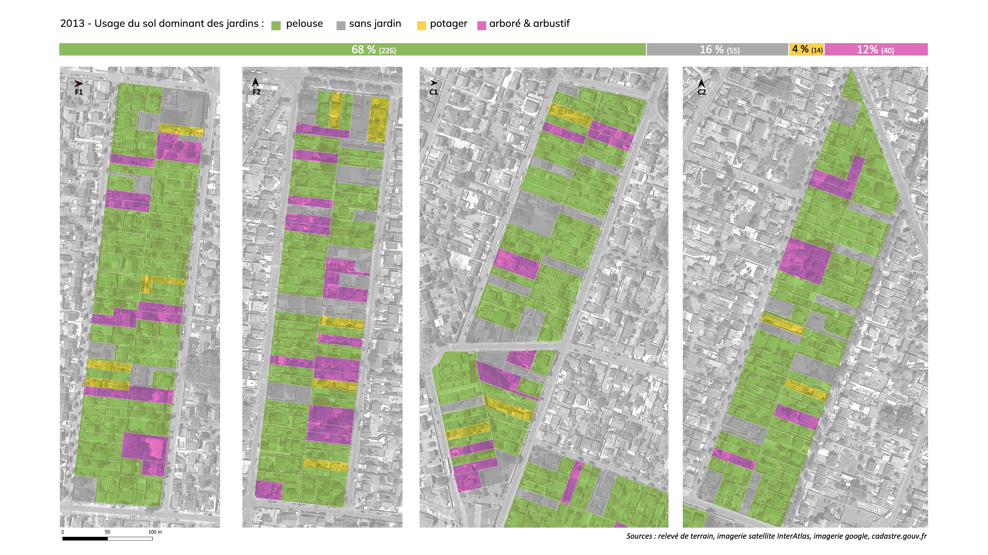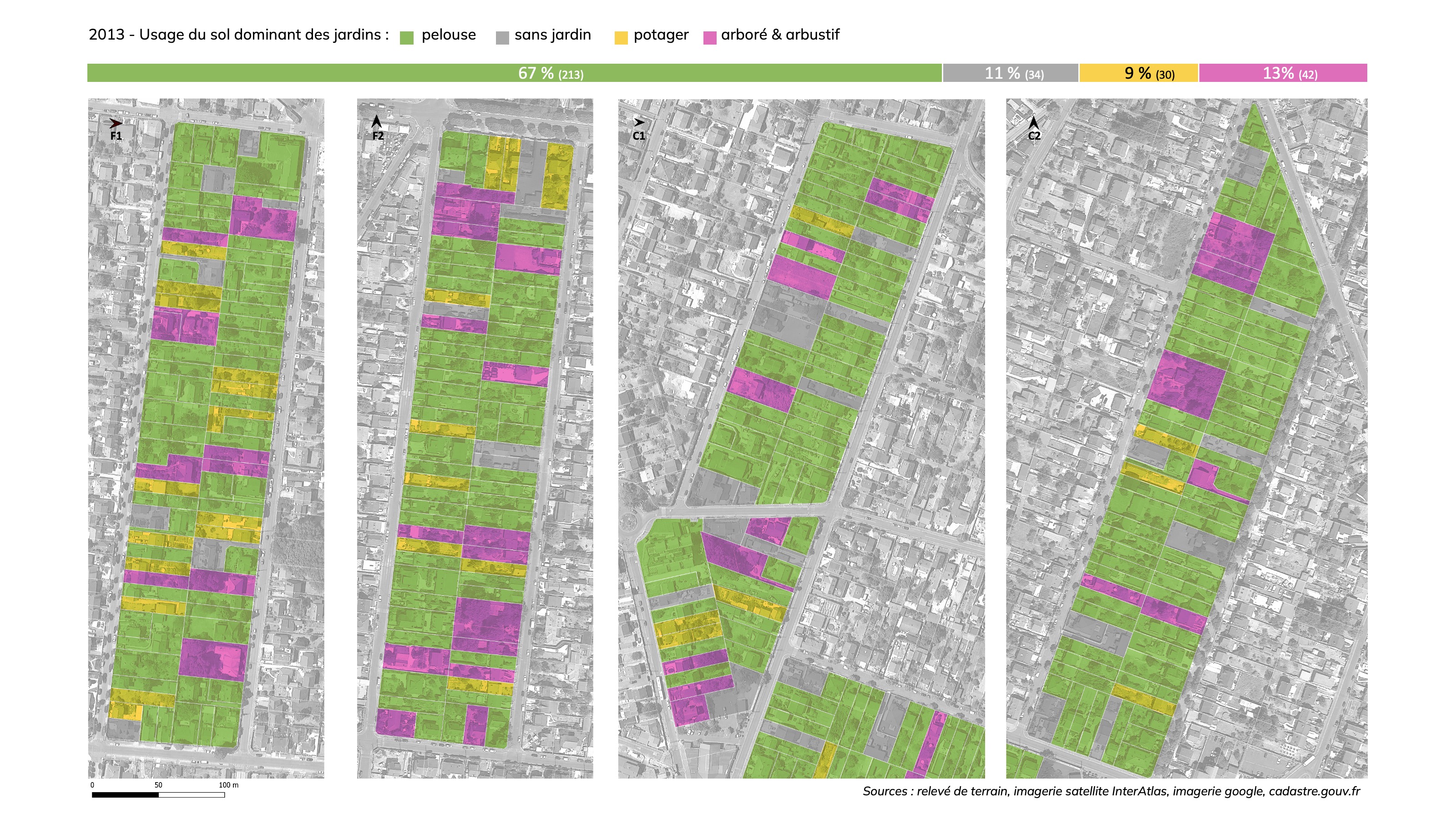 En 2023 un travail d’actualisation des données sur l’usage des sols des jardins sur l’ensemble des parcelles de ces quatre îlots (335 parcelles à l’issue de recompositions cadastrales qui ont eu lieu au cours des dix années) a permis d’évaluer la dynamique d’évolution de l’usage des sols des jardins en dehors de tout projet de densification. Ce travail d’analyse comparative aboutit aux conclusions suivantes :