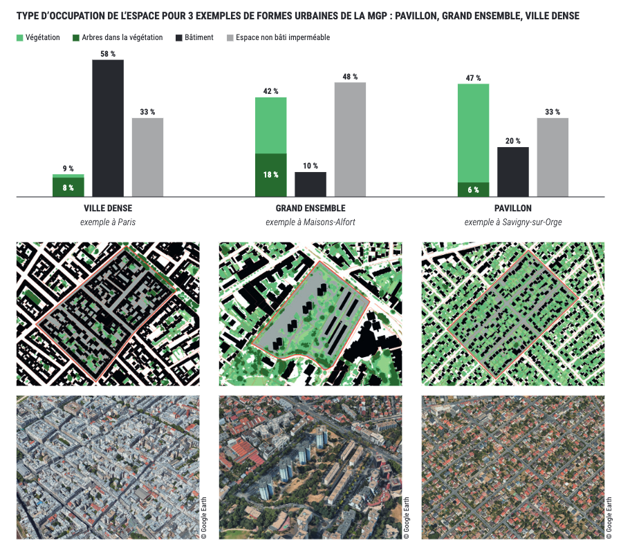On la retrouve par exemple dans l’étude de l’APUR sur les tissus pavillonnaires d’Ile-de-France, publiée en juin 2023 (Christiane BLANCOT, 2023). Les conclusions de cette étude prônent un statut quo de préservation, contraire à la densification des quartiers pavillonnaires. La justification avancée par l’étude est la suivante : les tissus pavillonnaires ayant les surfaces végétalisées les plus importantes au sein des tissus urbanisés de la Métropole du Grand Paris, ils joueraient un rôle majeur pour l’adaptation aux canicules dans un contexte d’évolution des conditions climatiques. Cette qualité découlant, selon l’étude, du seul taux de végétation, lequel serait mis en péril par toute forme de densification potentielle à venir.