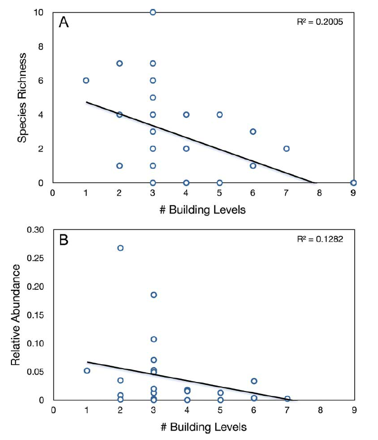 Les travaux du projet de recherche GROOVES sur l’écologie des toitures végétalisées (M. Barra, 2021), menés entre 2018 et 2021 par l’Institut Paris Région et l’Agence Régionale de la Biodiversité sous la conduite de Marc Barra et Hemminki Johan, ont mis en évidence une corrélation négative entre la surface de la toiture et la richesse en plantes spontanées. Pour expliquer ces résultats les chercheurs émettent l’hypothèse que la richesse en biodiversité 2 des toitures terrasses de plus petites surfaces seraient le résultat de leur meilleure résistance aux périodes de fortes chaleurs et à la sècheresse car davantage protégées par les éléments bâtis et naturels avoisinant et donc moins soumis aux vents. La question du gabarit bâti, et en particulier de sa hauteur, est également identifiée comme un facteur à considérer (Maclvor, 2016) : l’étude de la nidification des abeilles sauvages et des guêpes sur 29 toitures végétalisées de Toronto aboutit à la conclusion que les toitures végétalisées installées sur des bâtiments de faible hauteur sont à privilégier pour favoriser ces espèces en milieux urbains (l’intérêt de la toiture pour ces taxons diminuant avec la hauteur, avec un seuil limite identifié à 4 étages d’habitation maximum).