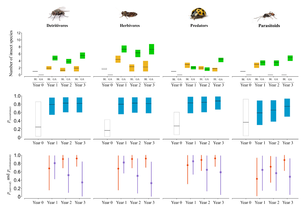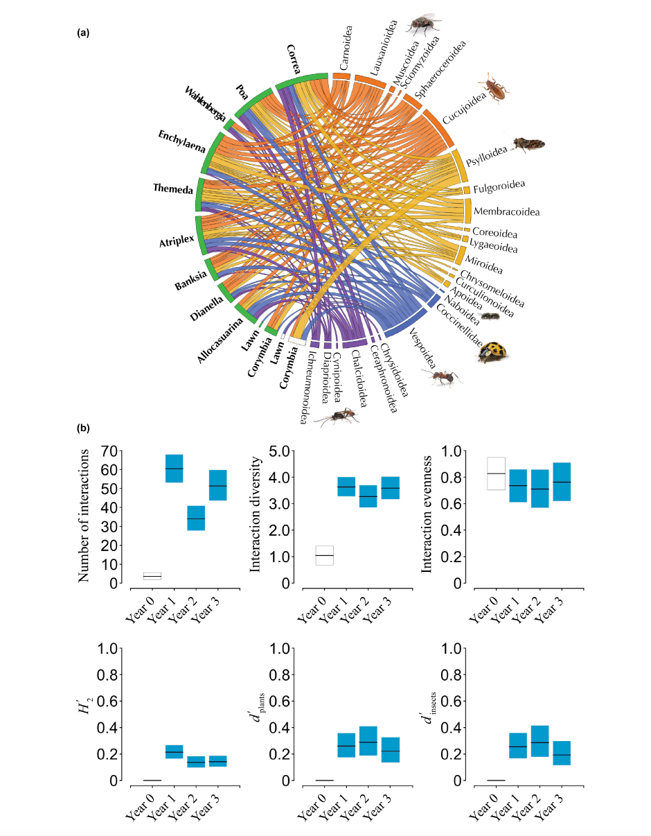 ![(a) Réseaux quantitatifs bipartis d’interactions (accords) entre espèces végétales (référence : boîtes blaches ; verdissement [année 3] : vert) et clades d’insectes (détritivores : orange ; herbivores : jaune ; prédateurs : bleu ; parasitoïdes : violet). La largeur de la corde reflète la relative richesse des espèces d’insectes du clade donné représenté dans l’interaction. (b) Au niveau du réseau (richesse des interactions, diversité et uniformité; et spécialisation : H 2) ou au niveau de l’espèce (spécialisation plantes et insectes : d plantes, d insectes) métriques pour l’année 0 (boîte blanche) et Année 1, Année 2 et Année 3 (cases bleues), telles qu’estimées par les modèles linéaires généralisés. Les lignes noires horizontales représentent les estimations moyennes et encadre l’incertitude associée aux intervalles de crédibilité à 95 %. (Mata et al., 2023)](img/mata_2.png)